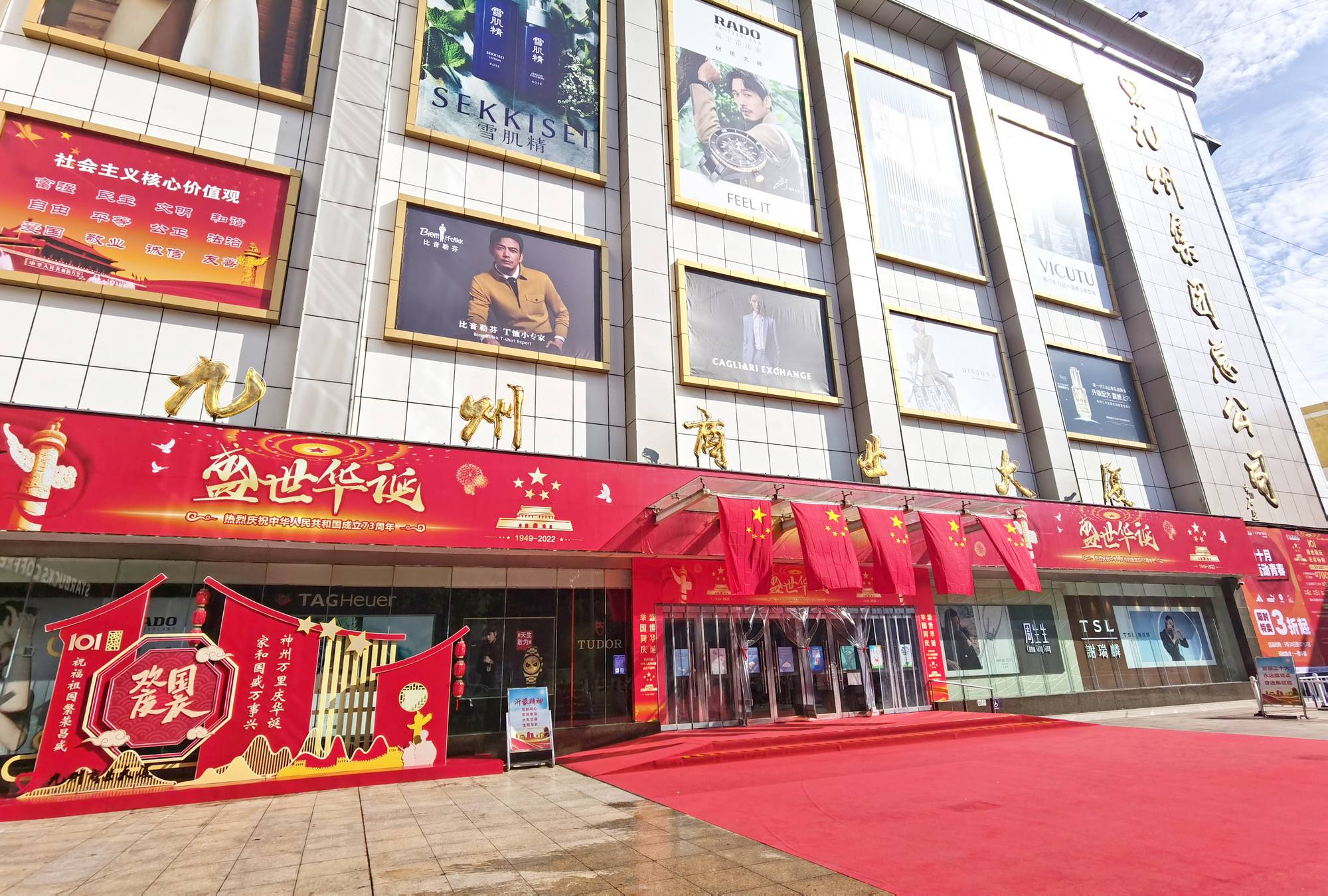 和煦的陽光將門前廣場上的紅色地毯描上了一層金邊,“歡度國慶”大型宣傳欄與“盛世華誕”宣傳畫交相輝映,全場彌漫著歡樂祥和的氛圍。百余名群眾自發(fā)來到九州商業(yè)大廈解放路店門前廣場,見證五星紅旗冉冉升起的莊嚴時刻。