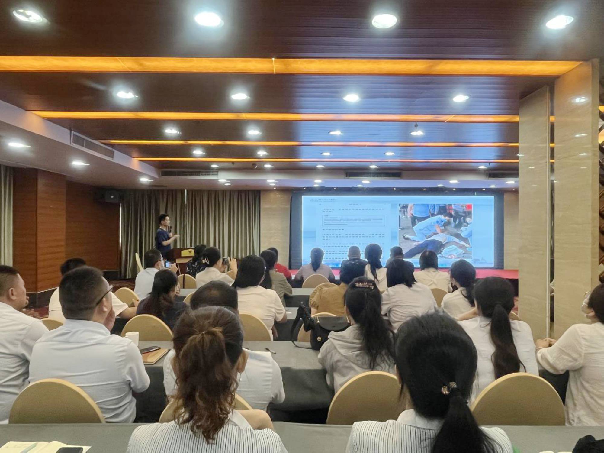 本次培訓(xùn)邀請了臨沂市人民醫(yī)院急診中心的張煒、沈曉龍兩位醫(yī)生進行授課。培訓(xùn)分為理論學(xué)習(xí)和現(xiàn)場演示兩個部分,理論學(xué)習(xí)包括生活中常見意外事故的處理、外傷的處理、海姆立克急救法及心肺復(fù)蘇流程等內(nèi)容,課件圖文并茂、案例生動形象、講解通俗易懂,具有很強的實用性和指導(dǎo)性,F(xiàn)場演示環(huán)節(jié),老師手把手教大家如何進行心肺復(fù)蘇,演示講解海姆立克急救法的規(guī)范性操作及細節(jié),參訓(xùn)人員在老師的指導(dǎo)下進行實操練習(xí)。