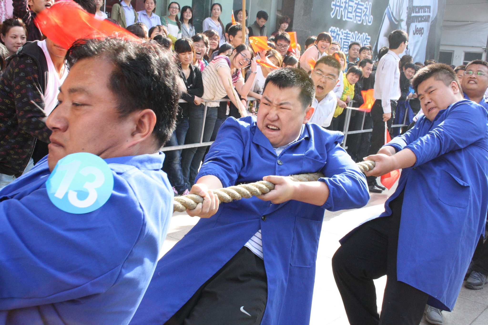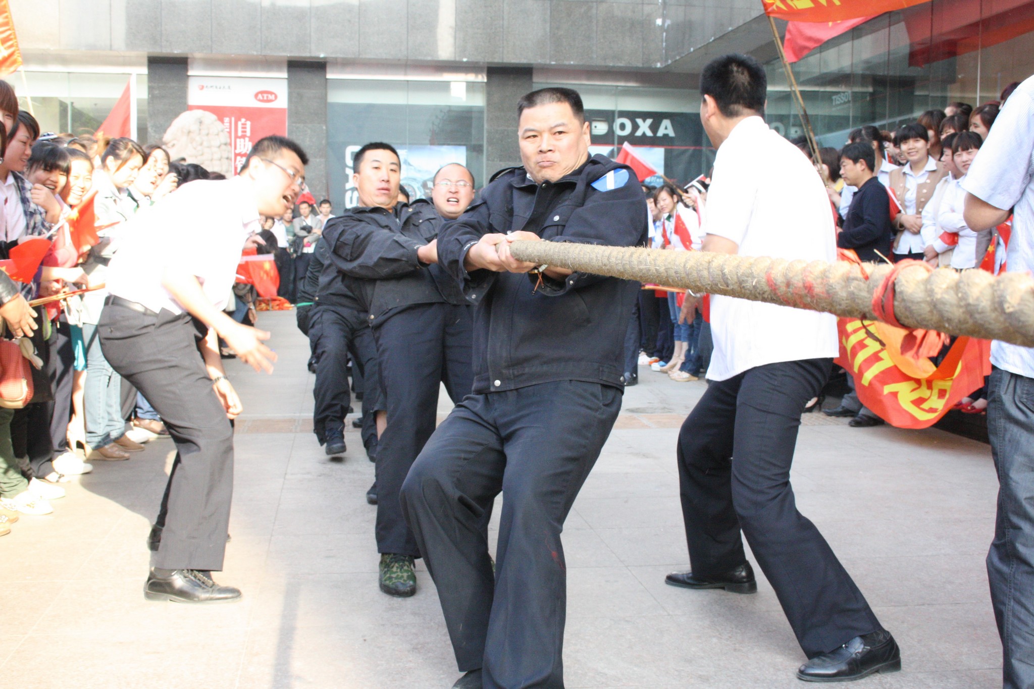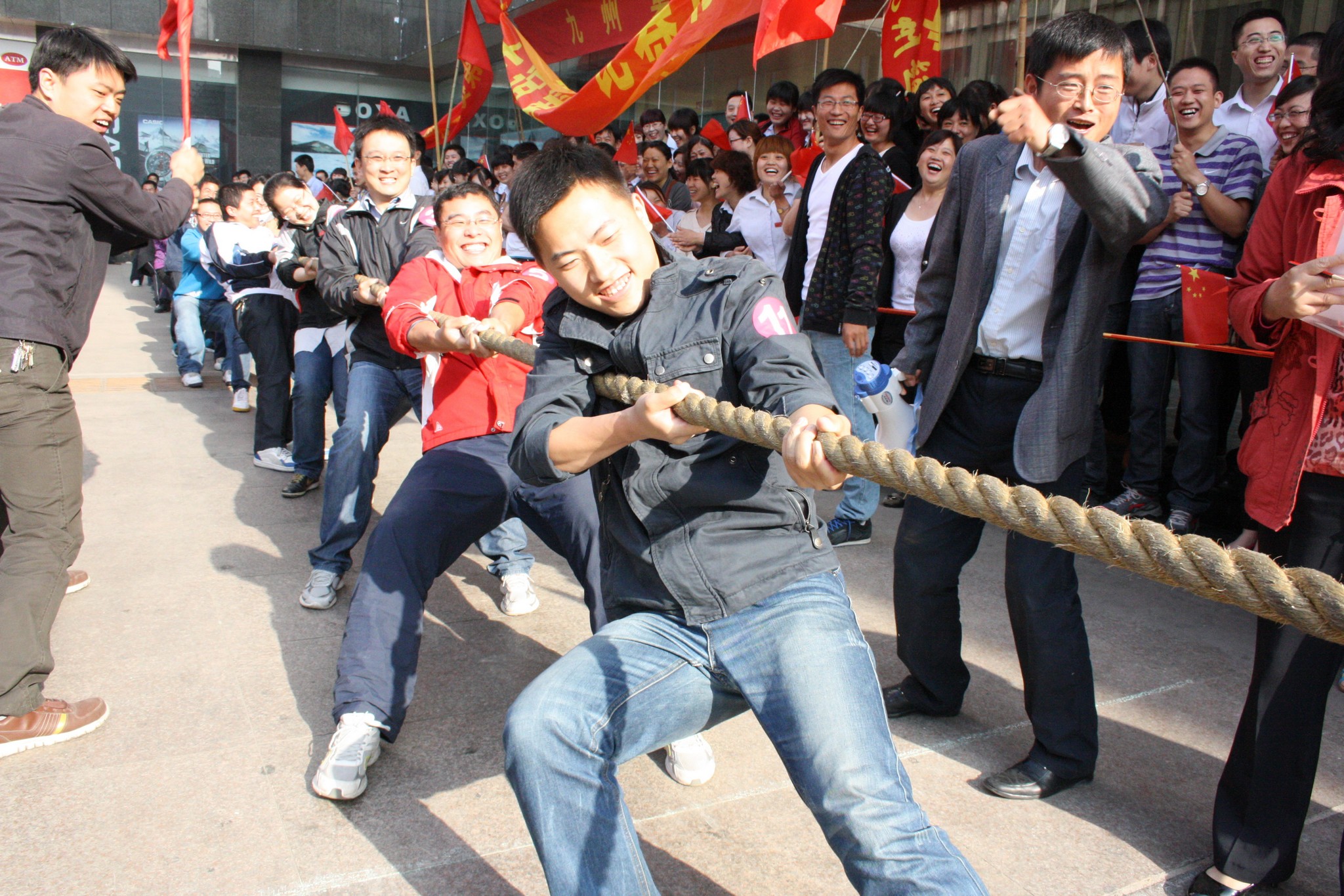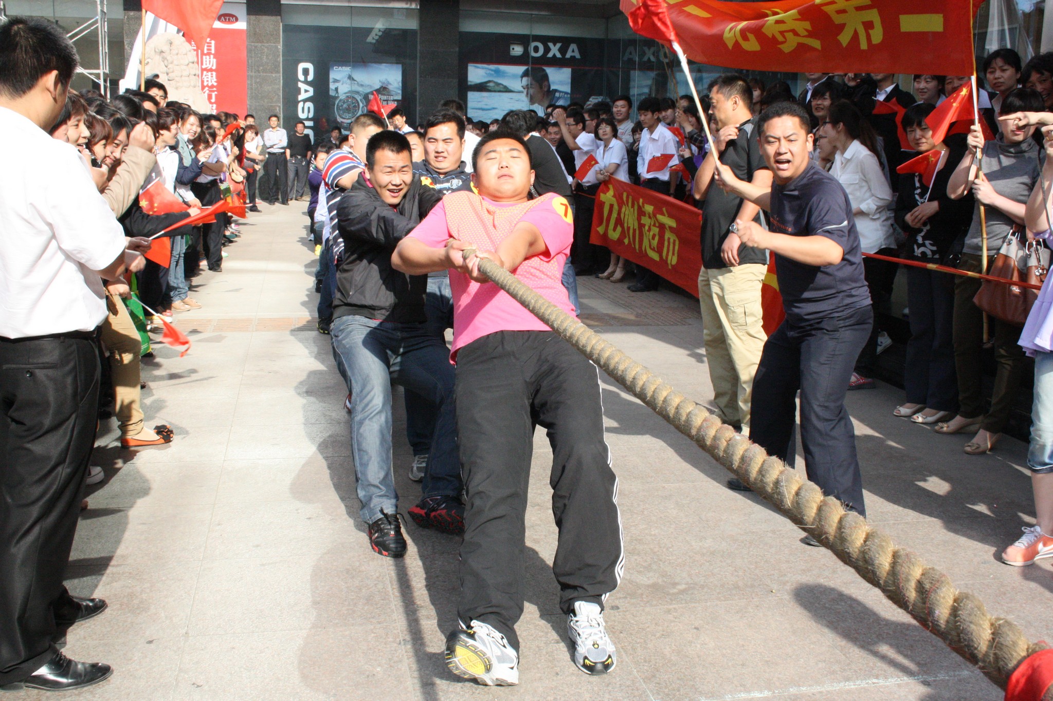 5月16日,2012年職工運(yùn)動會拔河比賽項(xiàng)目在九州大廈門前廣場舉行。大廈、超市、賓館、宜家佳、汽貿(mào)和集團(tuán)行政六支代表隊參加比賽。經(jīng)過激烈角逐,超市、宜家佳和汽貿(mào)分獲冠、亞、季軍。