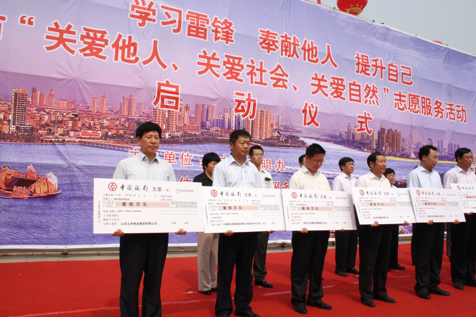 6月3日,臨沂市“關(guān)愛他人、關(guān)愛社會(huì)、關(guān)愛自然”志愿服務(wù)活動(dòng)啟動(dòng)儀式在人民廣場(chǎng)舉行。中國(guó)志愿服務(wù)基金會(huì)副理事長(zhǎng)段汝官,省文明辦專職副主任王紅勇,市委書記、市人大常委會(huì)主任張少軍等中央、省、市領(lǐng)導(dǎo)出席啟動(dòng)儀式;顒(dòng)現(xiàn)場(chǎng),集團(tuán)黨委書記王佐文代表集團(tuán)向“三關(guān)愛”志愿服務(wù)活動(dòng)捐款10萬元,集團(tuán)紀(jì)檢書記、工會(huì)主席石紹獻(xiàn)帶領(lǐng)九州學(xué)雷鋒志愿者參加啟動(dòng)儀式。 “關(guān)愛他人、關(guān)愛社會(huì)、關(guān)愛自然”志愿服務(wù)活動(dòng)是中央文明辦在整合各類志愿服務(wù)項(xiàng)目的基礎(chǔ)上,在全國(guó)部署開展的品牌志愿工作項(xiàng)目,是推動(dòng)學(xué)雷鋒活動(dòng)常態(tài)化的重大舉措。作為省級(jí)文明單位,集團(tuán)高度重視、精心組織,捐助愛心基金、組織學(xué)雷鋒志愿者……用實(shí)際行動(dòng)深入踐行雷鋒精神,開展扎實(shí)有效的志愿活動(dòng)推動(dòng)我市文明進(jìn)程。