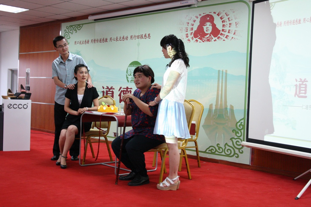 大廈員工在表演根據(jù)身邊真實故事改編的短劇《生日》